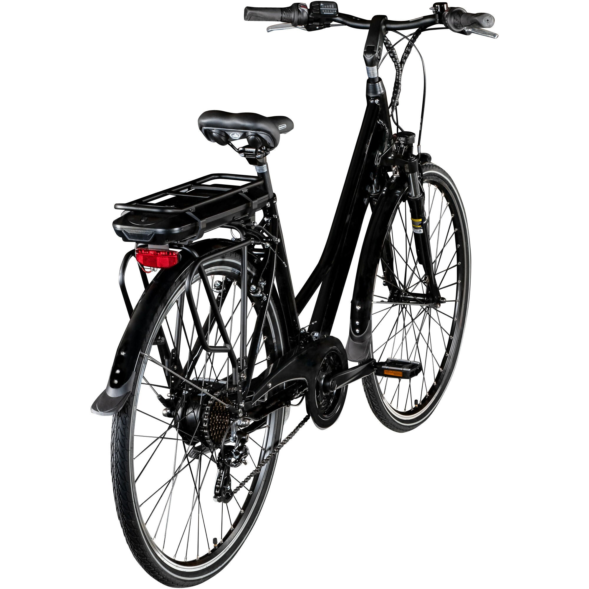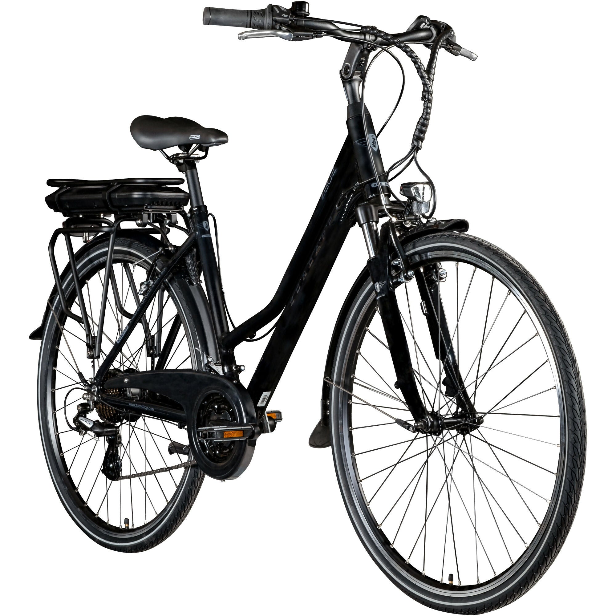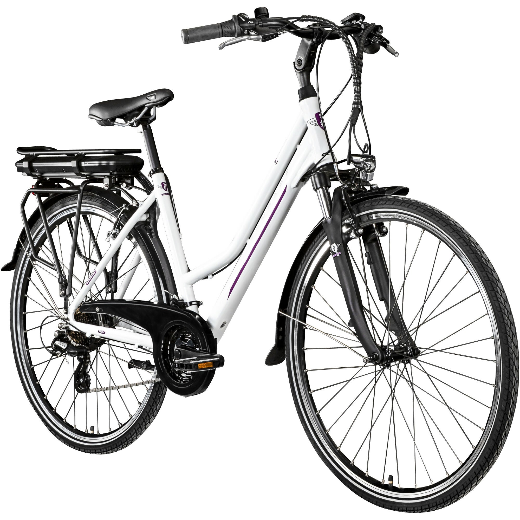 Das Damen Trekkingrad E Bike Zündapp Z802 mit Nabenmotor ist ein komfortables Pedelec mit 21 Gängen für Fahrer ab 155 cm Körpergröße, mit 374 Wh Fahrradakku