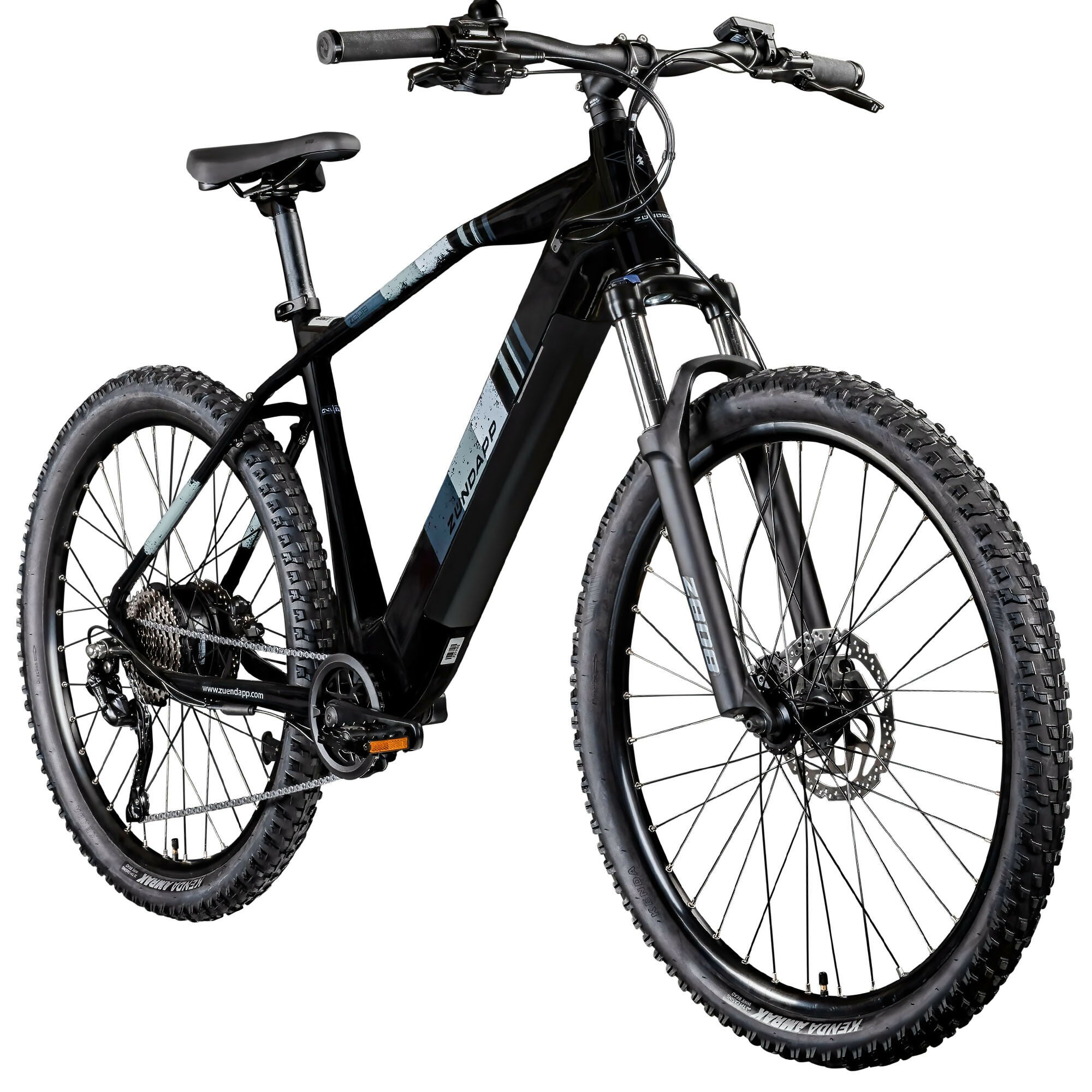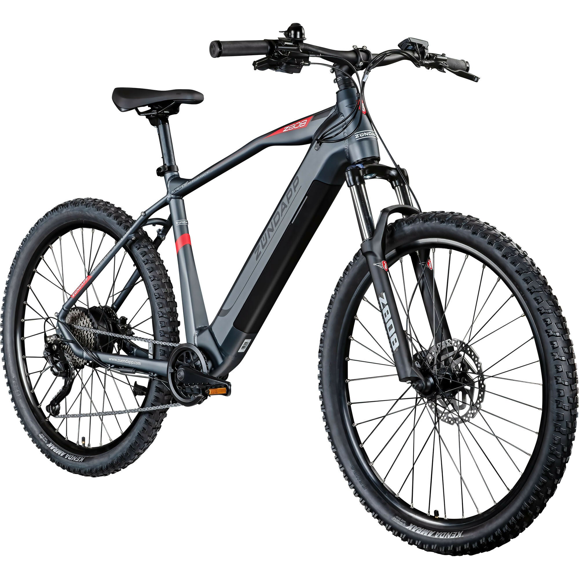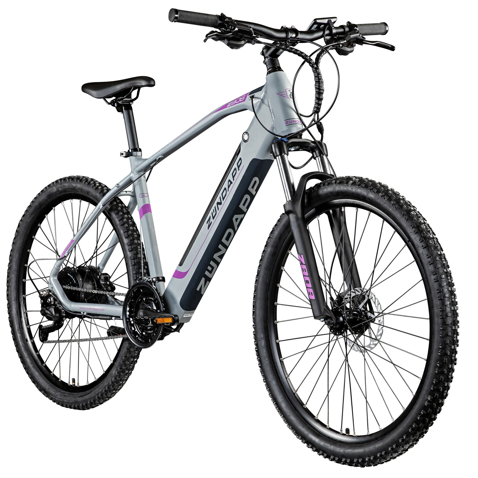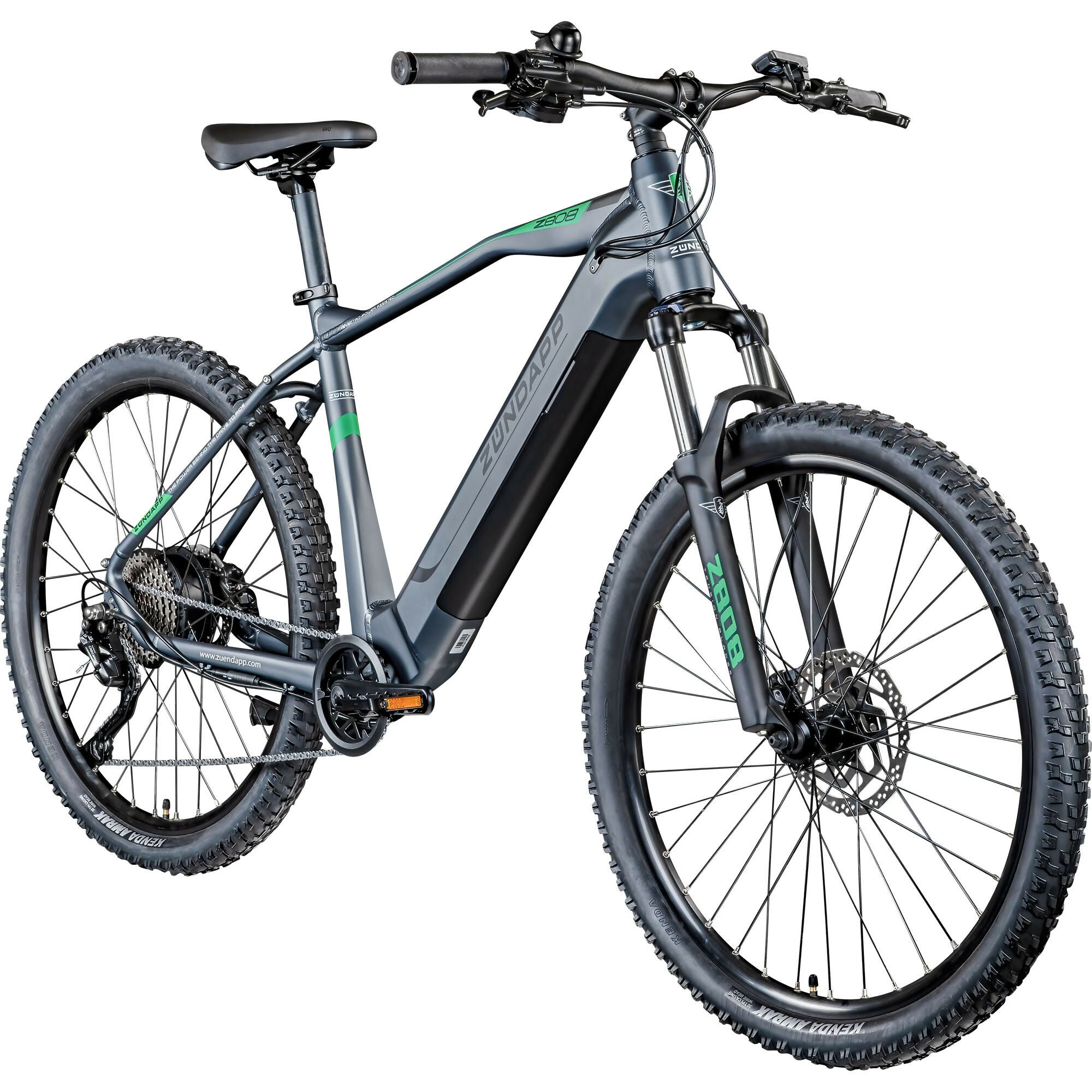 Das Zündapp Z808 Elektromountainbike mit 27,5 Zoll Rädern bietet elektrische Unterstützung bis 25 Kilometer pro Stunde, einen 540 Wattstunden Akku, Shimano zehn Gang Schaltung, hydraulische Scheibenbremsen und Federgabel.